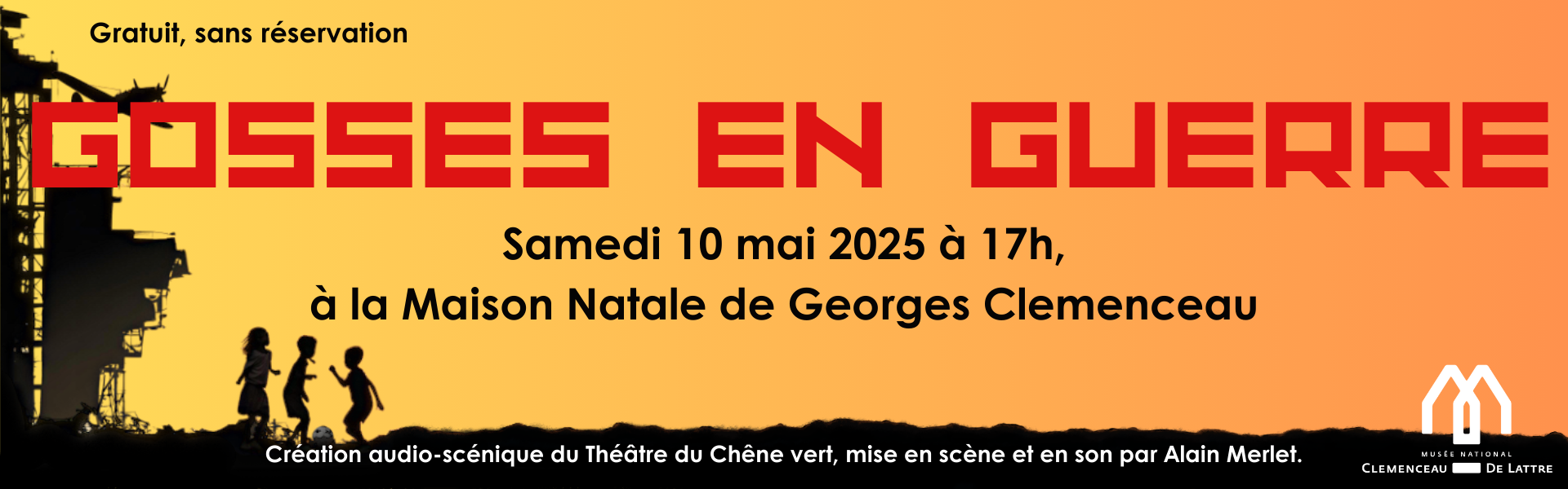 Le musée national Clemenceau-de Lattre vous invite à venir découvrir Gosses en Guerre, la nouvelle création du Théâtre du Chêne-Vert, le samedi 10 mai 2025, à 17h à la Maison Natale de Georges Clemenceau.