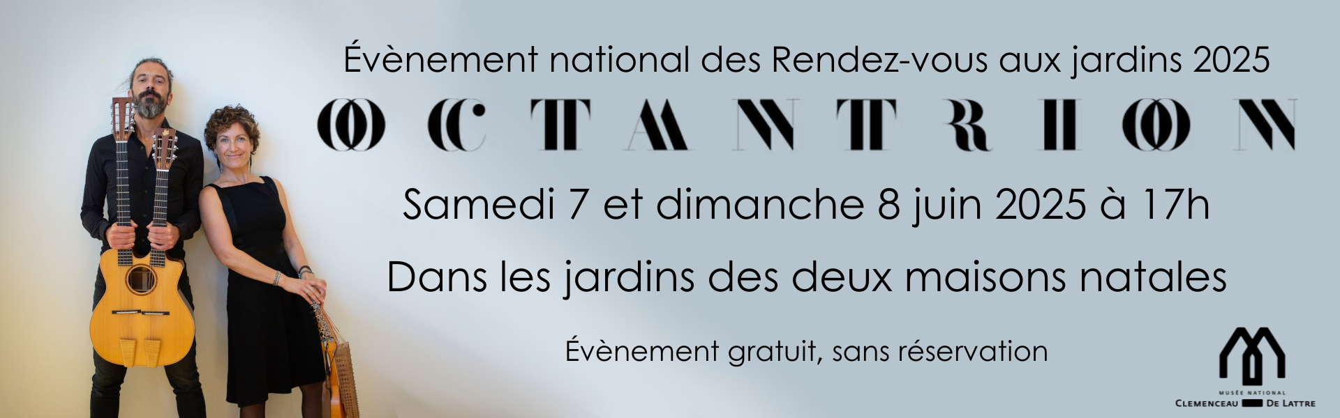 Dans le cadre de l’Évènement national des Rendez-vous aux Jardins 2025, le musée national Clemenceau-de Lattre vous invite à assister au concert d’Octantrion, duo formé par Eléonore Billy et Gaëdic Chambrier qui se déroulera dans les jardins des deux maisons natales les samedi 7 et dimanche 8 juin à 17h.